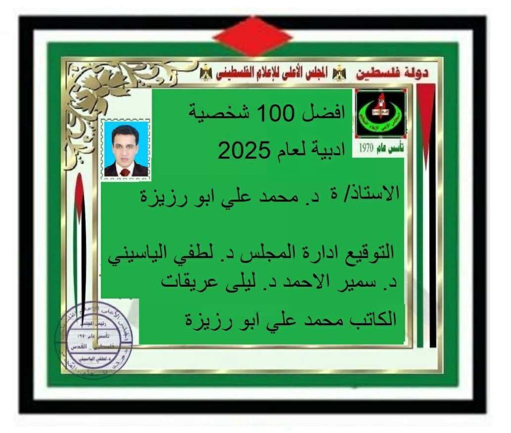،آشور- محمد علي أبورزيزة.. شرفٌ وفضلٌ وكرمٌ من أهله يغمرني فأعتز به وأفخر ، من فلسطين الحبيبة ، ومن عاصمتها الأبدية القدس الشريف ، ومن رجال صدقوا ماعاهدوا الله عليه وما بدلوا تبديلًا ، مُنِحْتُ شهادة ” أفضل شخصية أدبية لعام 2025 ” فكل العمر شكرًا و تقديرًا و عرفانًا لكم شعبًا و وطنًا وأبطالًا عانقت تضحياتهم عنان السماء ، وكل الشكر والتقدير والإخلاص والوفاء للمجلس الأعلى للإعلام الفلسطيني برئاسة أستاذي ومعلمي الغالي ، عميد الشعراء والكتاب والأدباء و المجاهدين العرب وصقر القدس الشريف الشيخ الدكتور / لطفي عقل الياسيني ، وأستاذي الغالي رئيس مجلس الأمناء بالمجلس المستشار الدكتور / سمير الأحمد ، و نائب رئيس المجلس الدكتورة / ليلى عريقات ،