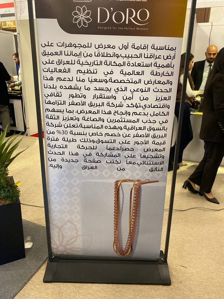 وقال رئيس مجموعة شركات المتحدة الاستاذ فلاح الشمري في تصريح لـ”آشور الاخبارية” إن “معرض المجوهرات العراقي هو الاول من نوعه وبرعاية وزارة التجارة العراقية و باشراف واسناد مستشارية الامن القومي والشركة العامة للمعارض والخدمات التجارية العراقية ، يضم صناعة توطين الذهب بمشاركة شركات عراقية وعربية ودولية واقليمية متخصصة في صناعة وتجارة المجوهرات”.