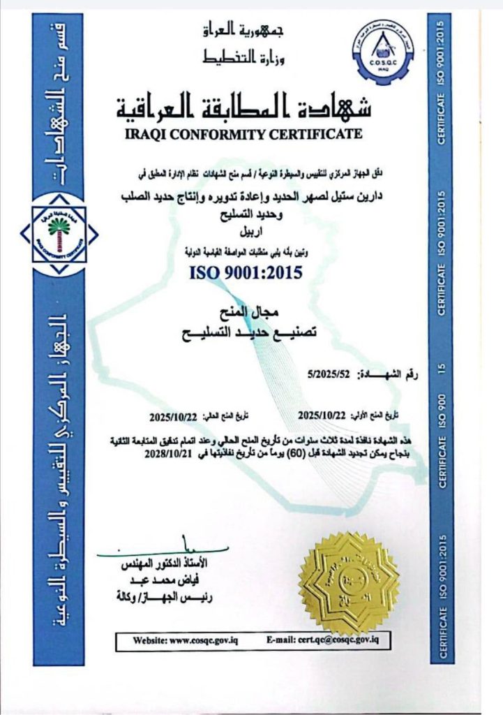 الجهاز المركزي للتقييس والسيطرة النوعية يمنح شهادة المطابقة العراقية لشركة دارين ستيل في أربيل