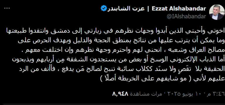/ آشور- في الوقت الذي خاطب السياسيين بلباقة، هاجم السياسي العراقي عزت الشابندر منتقدي زيارته الى سوريا ولقائه الرئيس احمد الشرع بشدة.