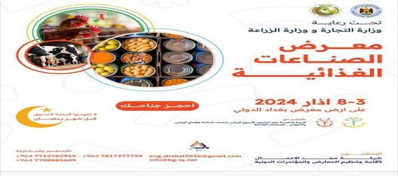 /آشور- تحتضن العاصمة بغداد ، فعاليات معرض الصناعات الغذائية ، التي ستنظمها وزارتا الزراعة والتجارة للفترة 3-8 اذار 2024 على أرض معرض بغداد الدولي ، بالتزامن مع معرض الاسبوع الزراعي الخامس عشر لمعدات المكننة والانتاج الزراعي والحيواني.(انتهى)