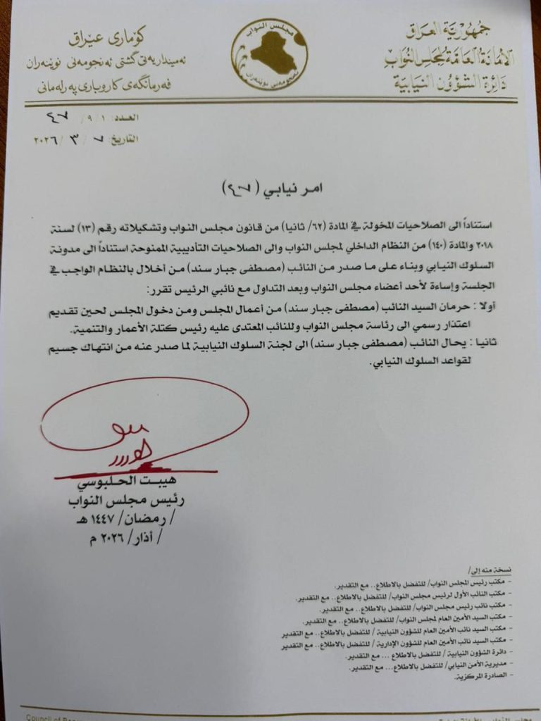 /آشور- أصدر مجلس النواب العراقي الأمر النيابي رقم (47) بتاريخ 7 آذار 2026، القاضي بحرمان النائب مصطفى جبار سند من حضور أعمال المجلس ومن دخول مبناه، لحين تقديم اعتذار رسمي إلى رئاسة المجلس وإلى النائب المعتدى عليه رئيس كتلة الإعمار والتنمية.