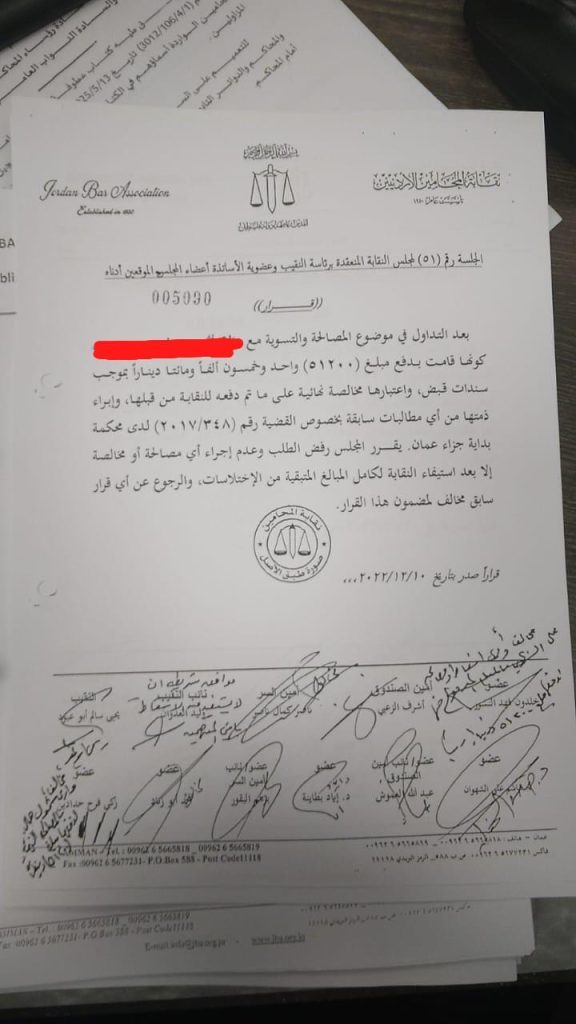تساؤلات حول قرار إسقاط حق نقابة المحامين الأردنيين في قضية جزائية