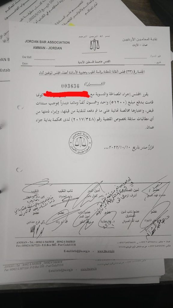 /آشور- يثير قرار سابق لبعض أعضاء مجلس نقابة المحامين الأردنيين تم اتخاذه بدفع من أحد الأعضاء المترشحين لمركز النقيب، تساؤلات قانونية ومهنية، بعد موافقة بعض أعضاء المجلس على إسقاط حق النقابة في قضية جزائية مرفوعة ضد موظفة سابقة في وحدة التأمين الصحي، رغم عدم تسديد كامل المبالغ المستحقة للنقابة.