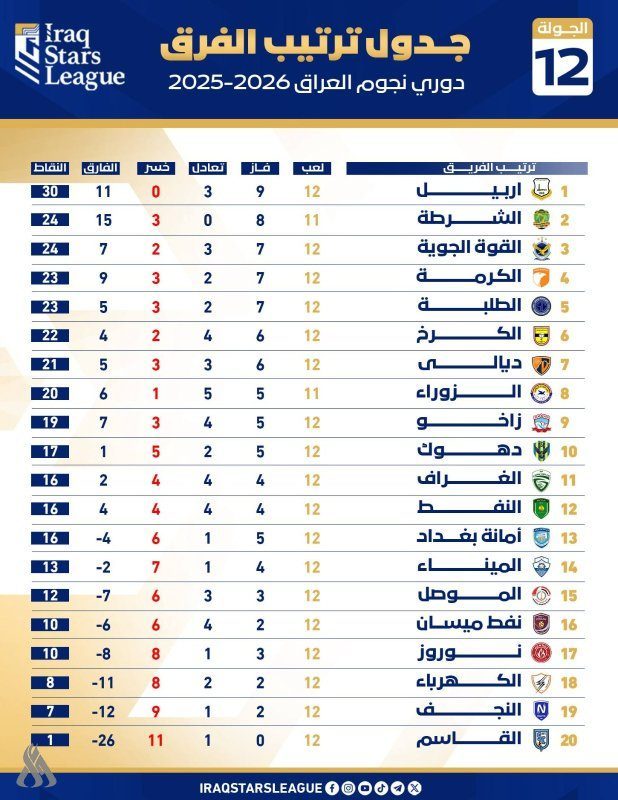 جدول ترتيب الفرق بعد نهاية الجولة الـ(12) من دوري نجوم العراق