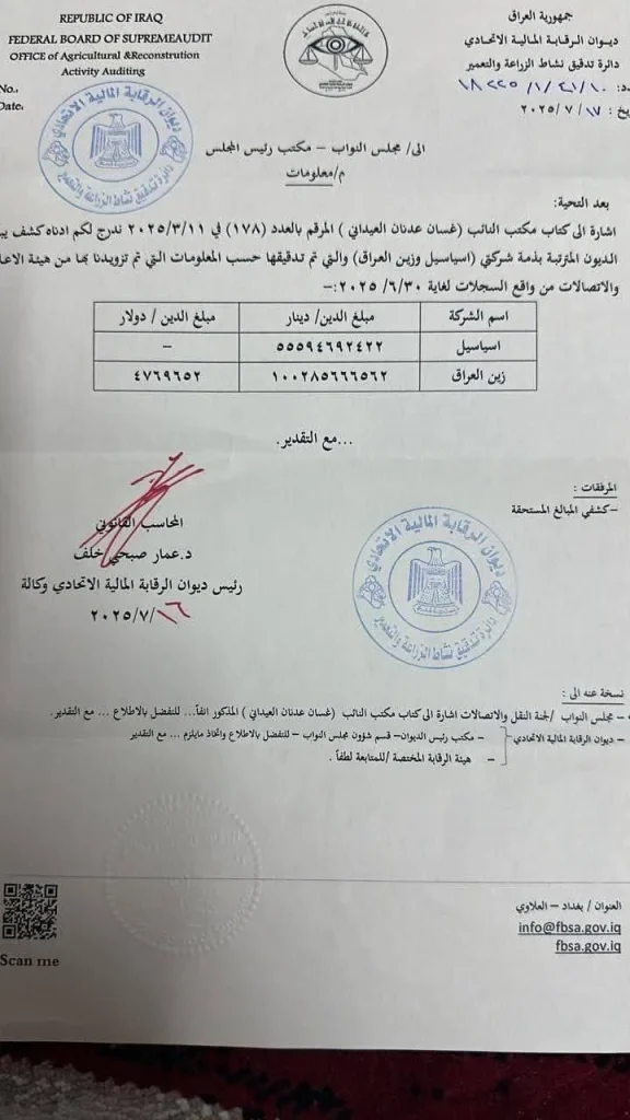 آشور /- في وثائق رسمية موجّهة إلى رئيس البرلمان العراقي، فجّر ديوان الرقابة المالية مفاجأة مدوية بإعلانه أن شركتي الاتصالات الأكبر في البلاد، زين العراق وآسيا سيل، مطلوبتان بمبالغ مالية هائلة لم تُسدّد منذ سنوات، وسط صمت حكومي يثير الشكوك.