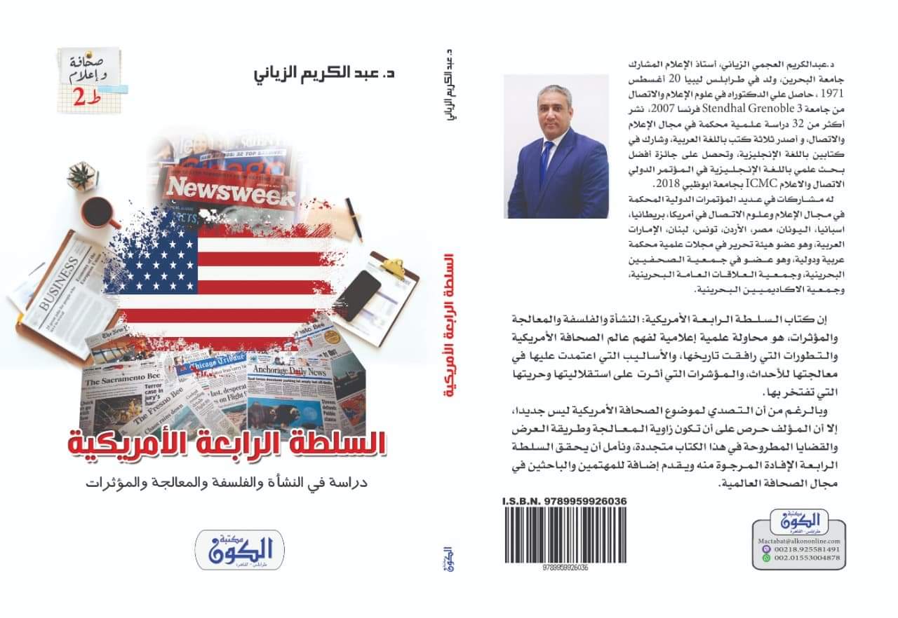 (آشور – متابعة)..أعلنت مكتبة الكون اليوم السبت صدور كتاب (السلطة الأمريكية الرابعة) في طبعته الثانية من تأليف الأكاديمي الليبي الدكتور عبد الكريم العجمي الزياني، أستاذ الإعلام في جامعة الفاتح سابقا واستاذ الإعلام في جامعة البحرين سابقا.