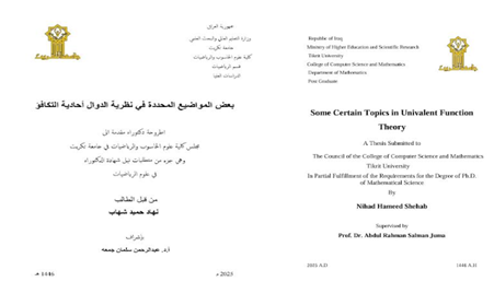 وكان عنوان الاطروحة ( بعض المواضيع المحددة في نظرية الدوال أحادية التكافؤ)
