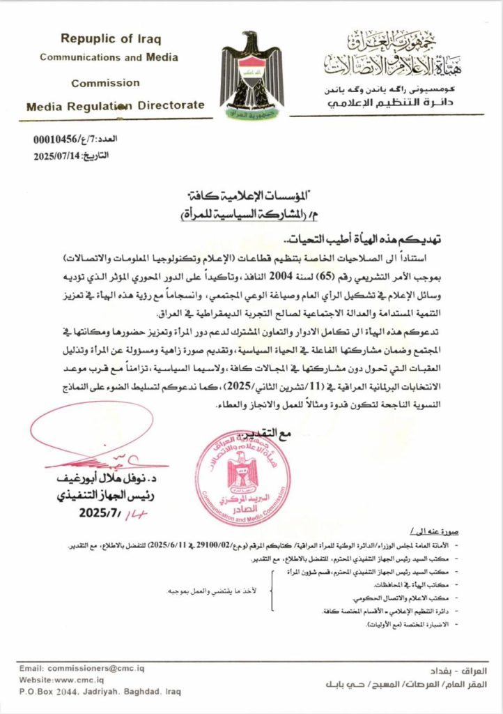 آشور/- تواصل هيأة الإعلام والاتصالات جهودها في ترسيخ القيم الدستورية وتعزيز دور الإعلام في دعم المسارات الديمقراطية، وتأكيد أهمية إبراز المشاركة السياسية للمرأة العراقية في الانتخابات البرلمانية المقررة في 11 تشرين الثاني 2025.