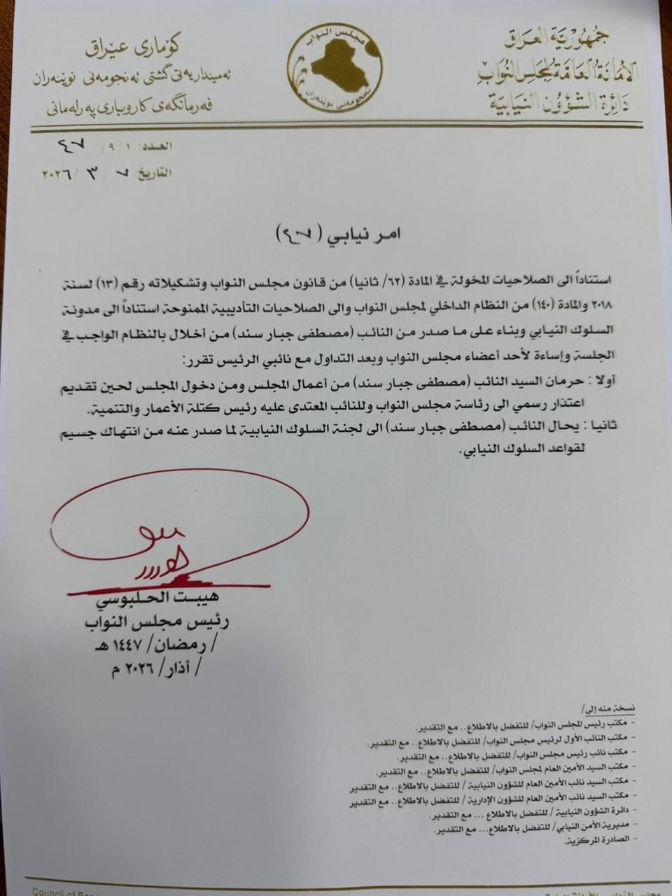 /آشور- أصدر مجلس النواب العراقي الأمر النيابي رقم (47) بتاريخ 7 آذار 2026، القاضي بحرمان النائب مصطفى جبار سند من ح�